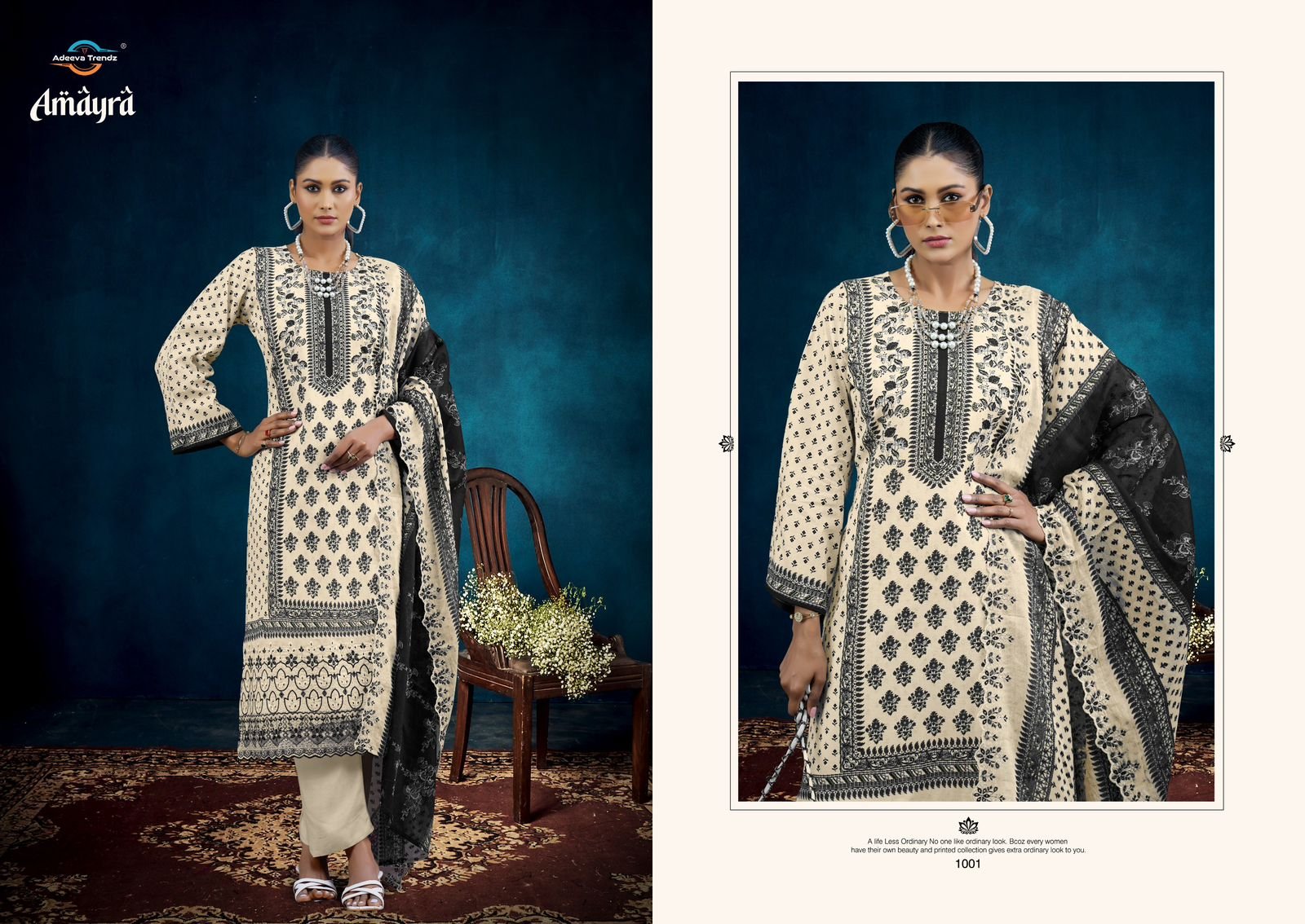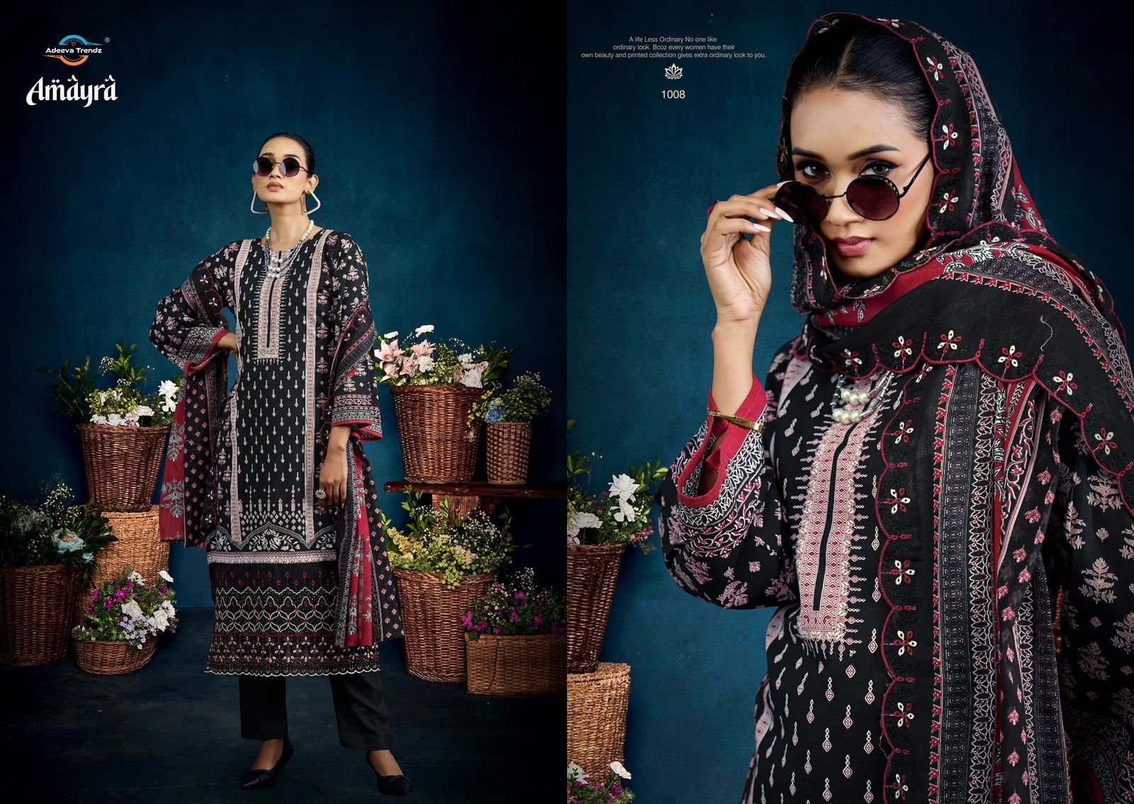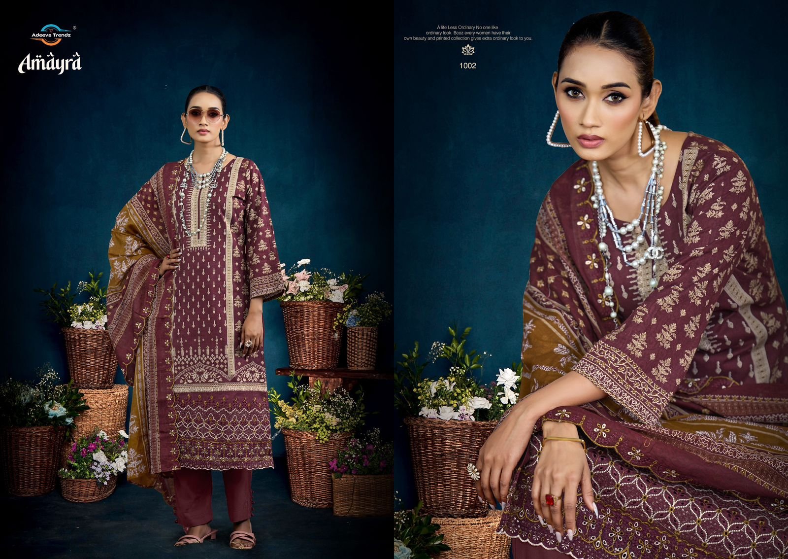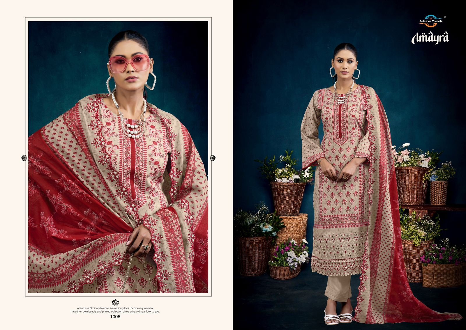 Bottom: 100% cotton camrik solid dyed; Cut: 3.00 mts**Dupatta: Pure 100% camrik mal dupatta all over print with 2 side cut work embroidery; Cut: 2.25 mts*