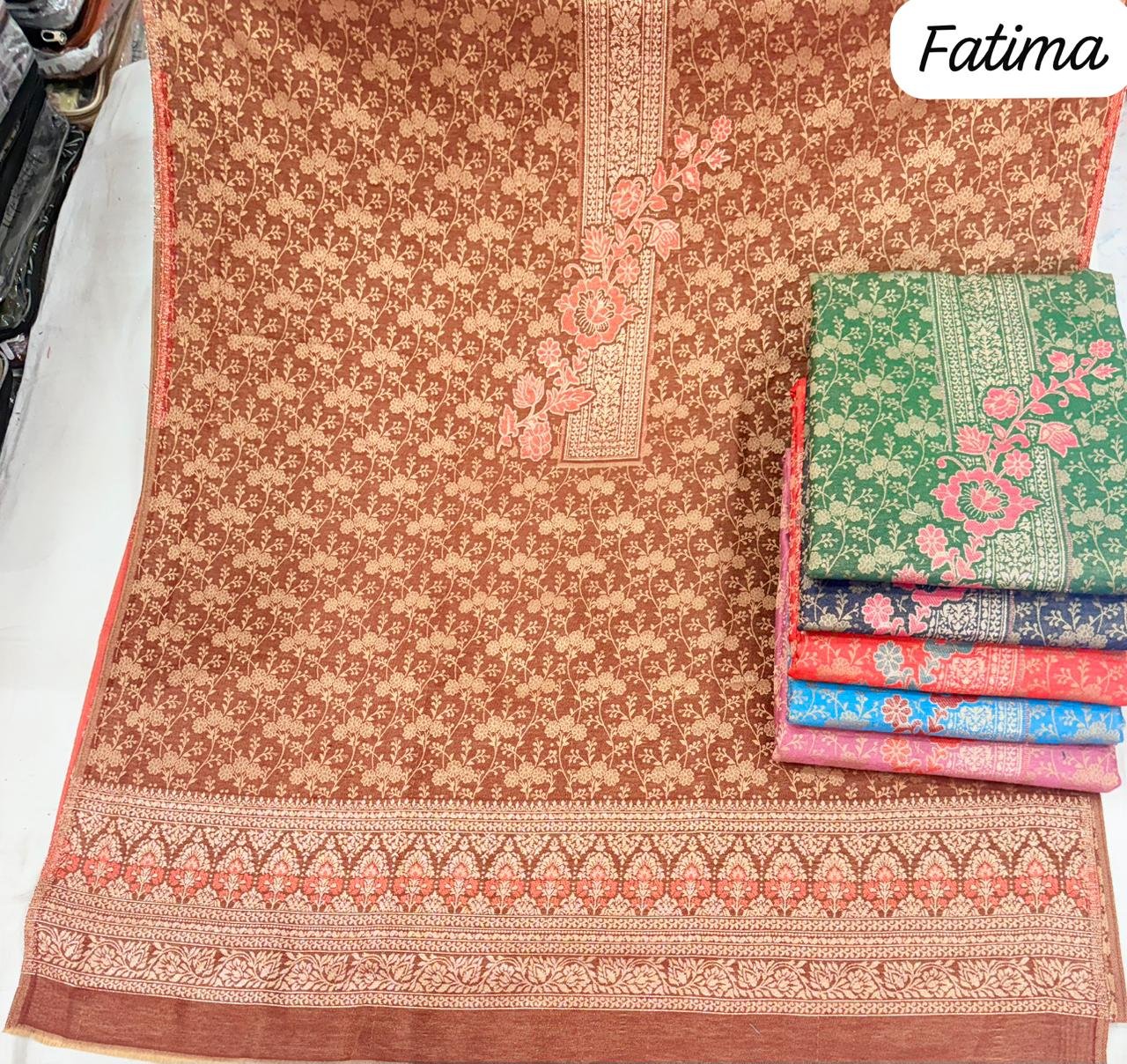 Top:- *PURE PASHMINA KANI JACQUARD VISCOSE ACRYLIC 2.5 MITTER APPROX*